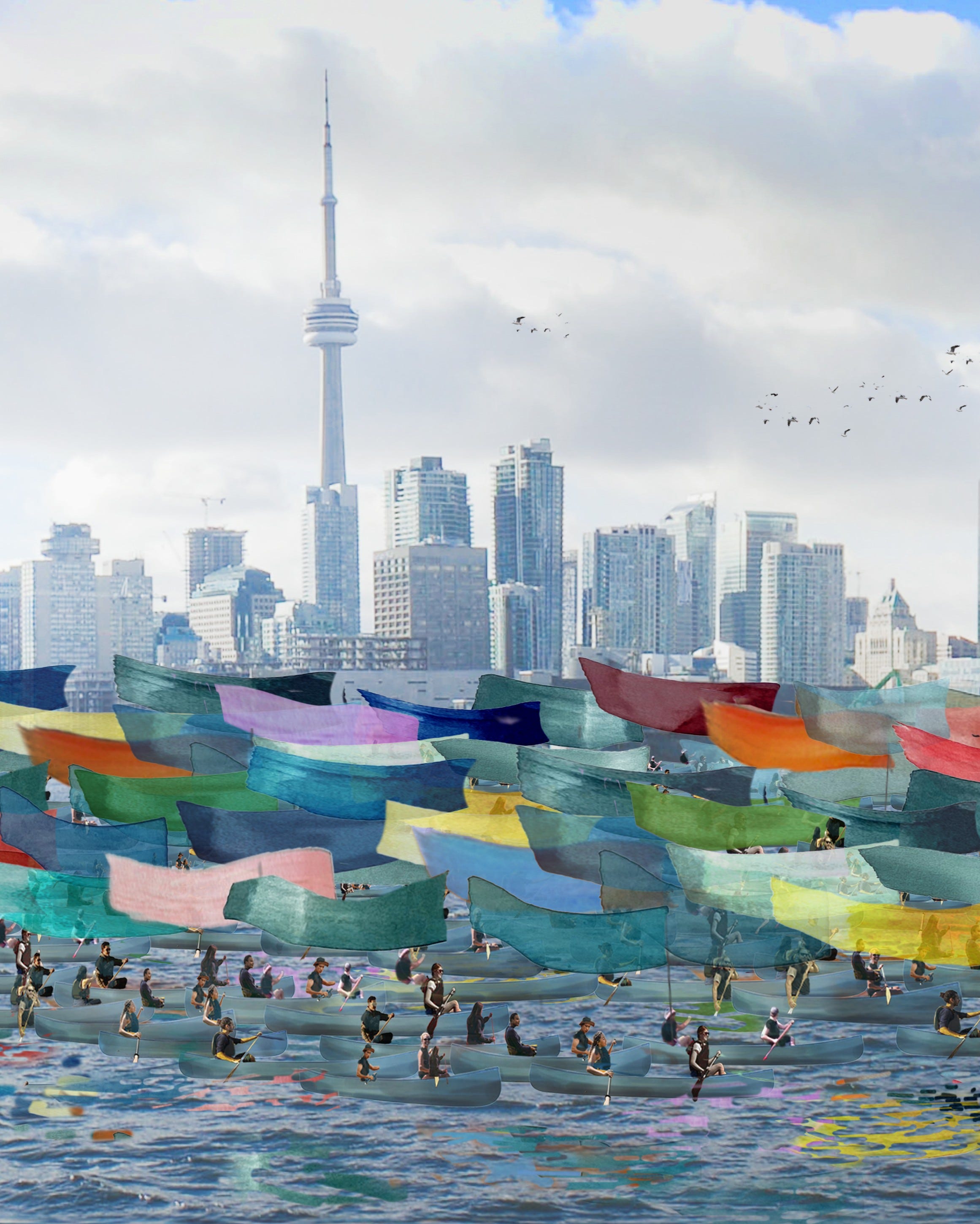 On September 27 and 28th, a procession of 120 canoes will move in unison across Toronto’s eastern Waterfront, each carrying color field paintings made with colors sourced from the lake/shoreline and activated by the wind. A Lake Story will write Lake Ontario’s color story across the sky and in its waters, amplifying the lake’s own voice of vibrancy, ecosystem, and community.